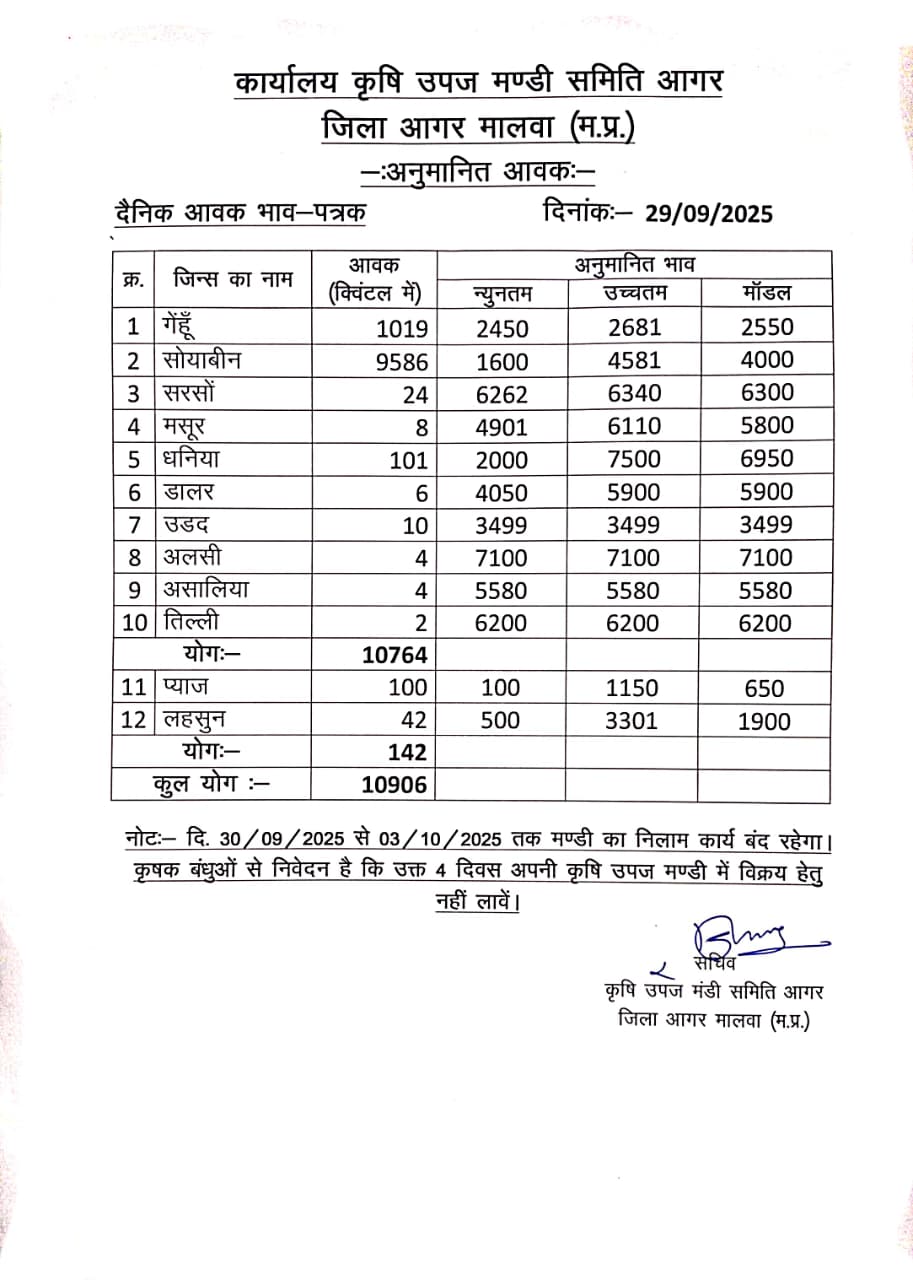 Today Agar Mandi Bhav | आज का आगर मंडी भाव दिनांक : 29 सितंबर 2025 सोमवार