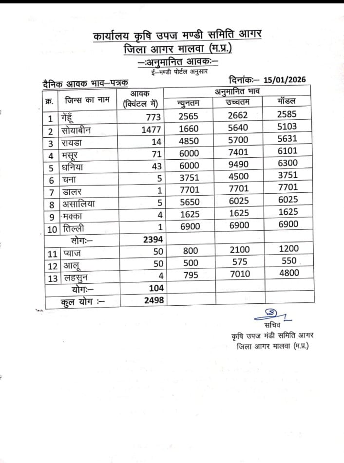 Today Agar Mandi Bhav | आज का आगर मंडी भाव दिनांक : 15 जनवरी 2026 गुरुवार