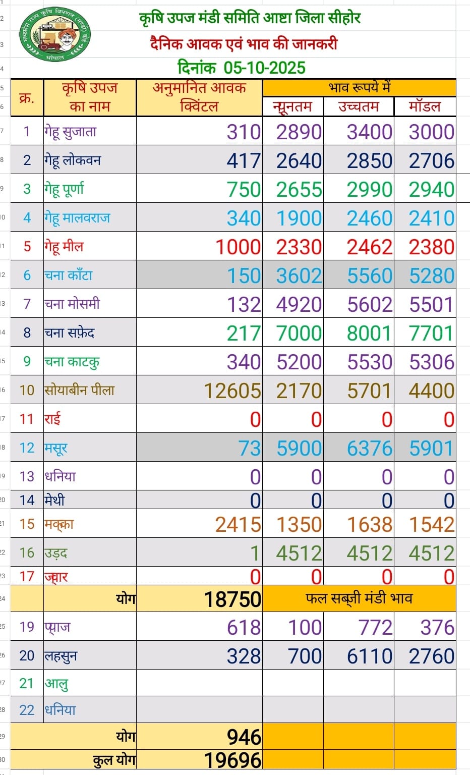 Note : आष्टा मंडी भाव चार्ट में दिखाए गए सभी भाव (100kg) प्रति क्विंटल में है।