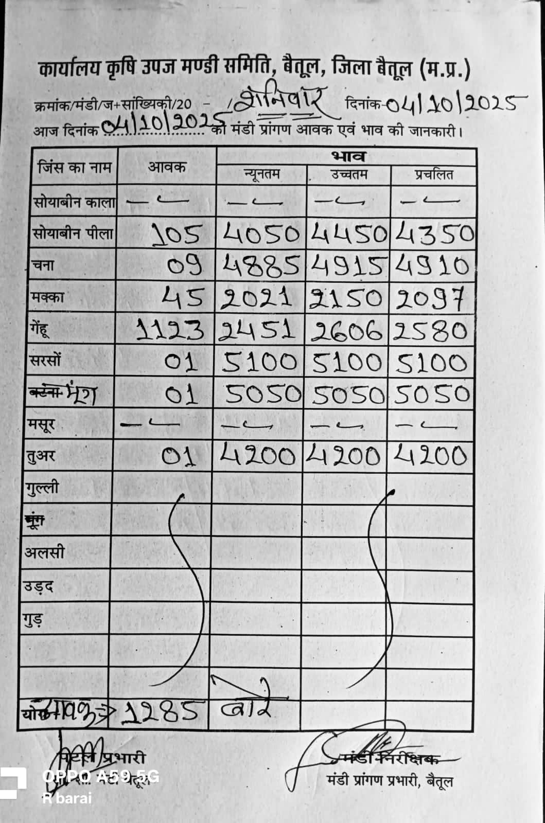 Today Betul Mandi Bhav | आज का बैतूल मंडी भाव दिनांक : 04 अक्टूबर 2025 शनिवार