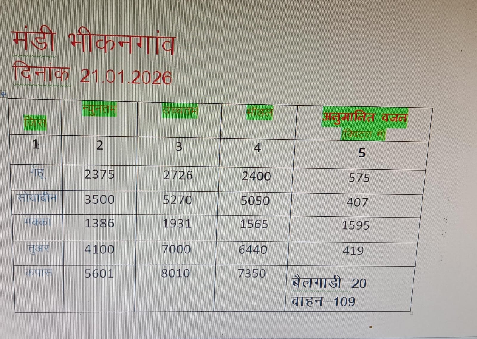 Today Bhikangaon Mandi Bhav | आज का भीकनगांव मंडी भाव दिनांक : 21 जनवरी 2026 गुरुवार