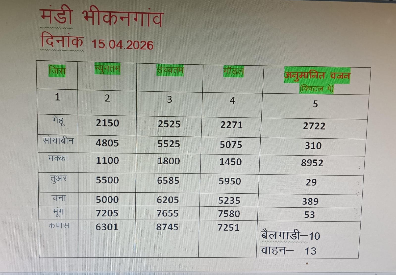 Today Bhikangaon Mandi Bhav | आज का भीकनगांव मंडी भाव दिनांक : 15 फरवरी 2026 बुधवार
