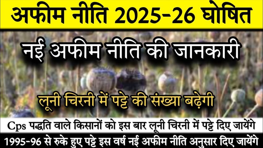 नमस्कार किसान भाइयों नई अफीम नीति 2025-26 घोषित अफीम नीति 2025-26 की सम्पूर्ण जानकारी अफीम नीति 2025 को लेकर महत्वपूर्ण बिंदु *1. लूनी चीरनी वाले किसानों को 10 आरी का पट्टा मिलेगा* *2. Cps में जिस किसान ने 90kg या उस से ज्यादा डोडा सरकार को दिया उन्हें 5 आरी में लूनी चिरनी में…
