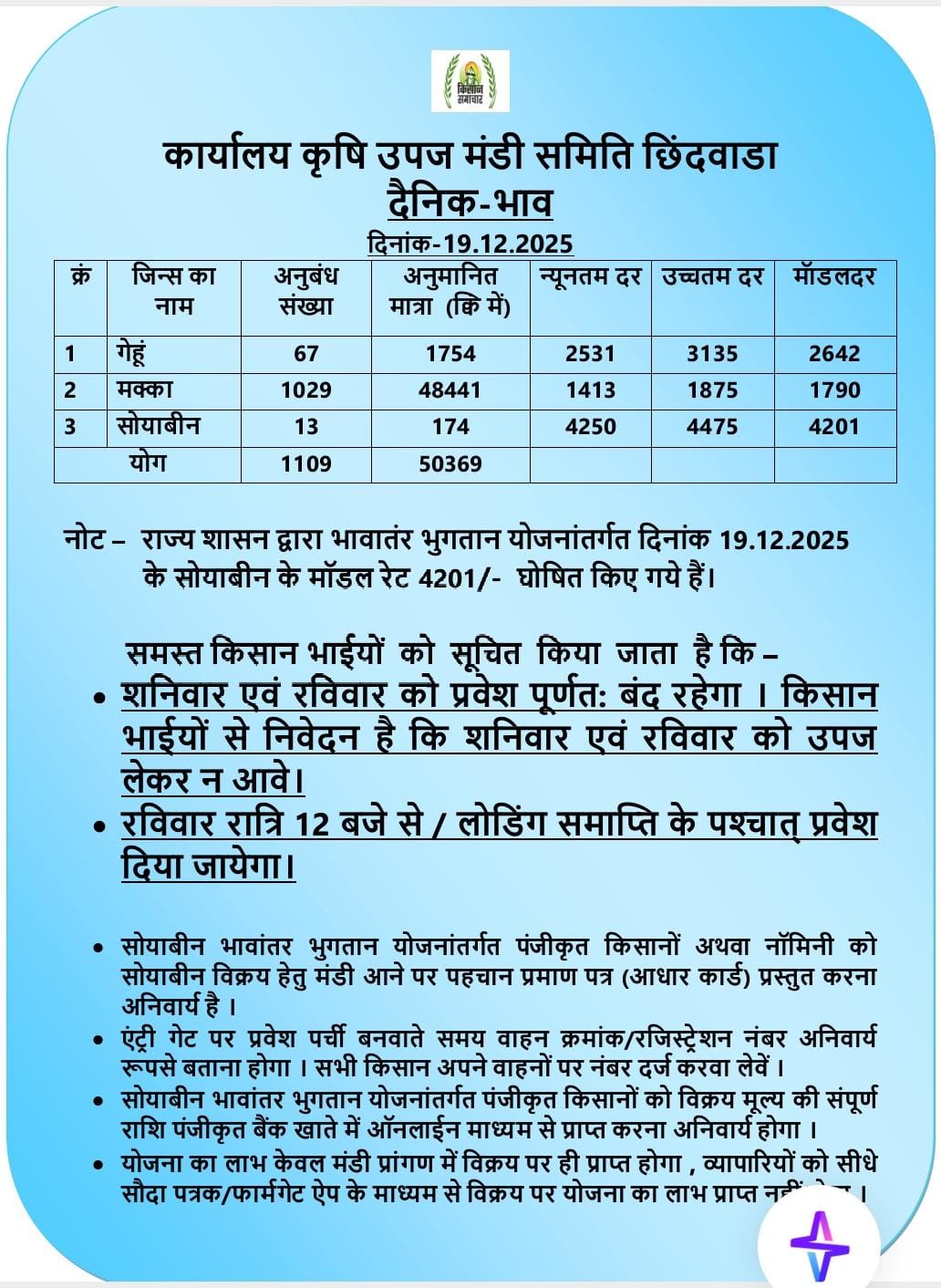 Today Chhindwara Mandi Bhav | आज का छिंदवाडा मंडी भाव दिनांक : 19 दिसंबर 2025 शुक्रवार