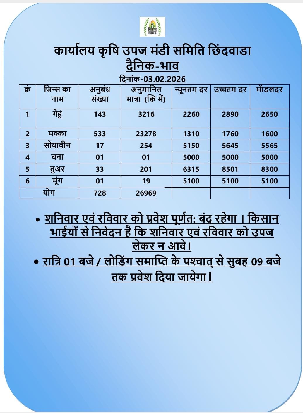 Today Chhindwara Mandi Bhav | आज का छिंदवाडा मंडी भाव दिनांक : 3 फरवरी 2026 मंगलवार