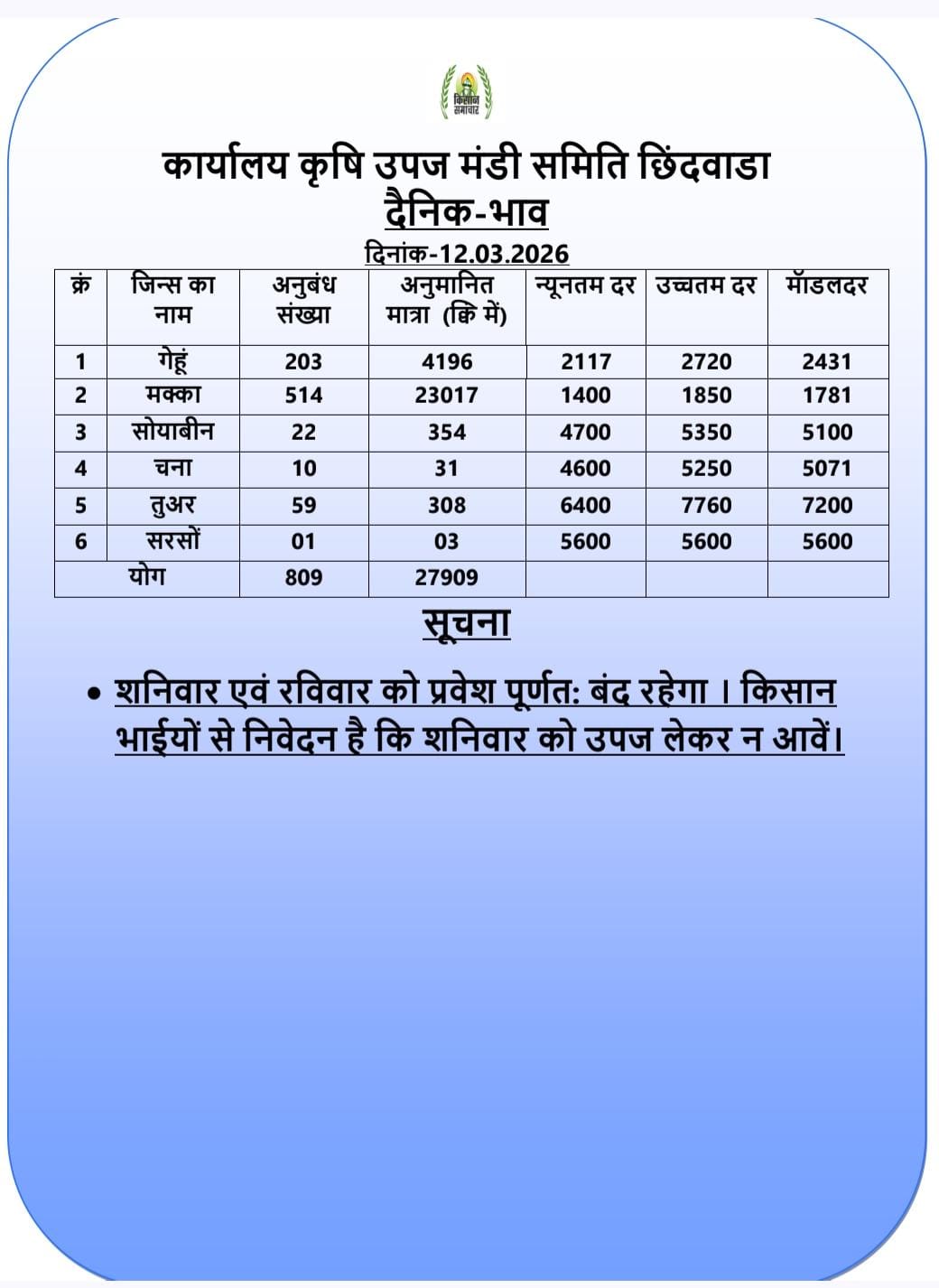 Today Chhindwara Mandi Bhav | आज का छिंदवाडा मंडी भाव दिनांक : 12 मार्च 2026 गुरुवार