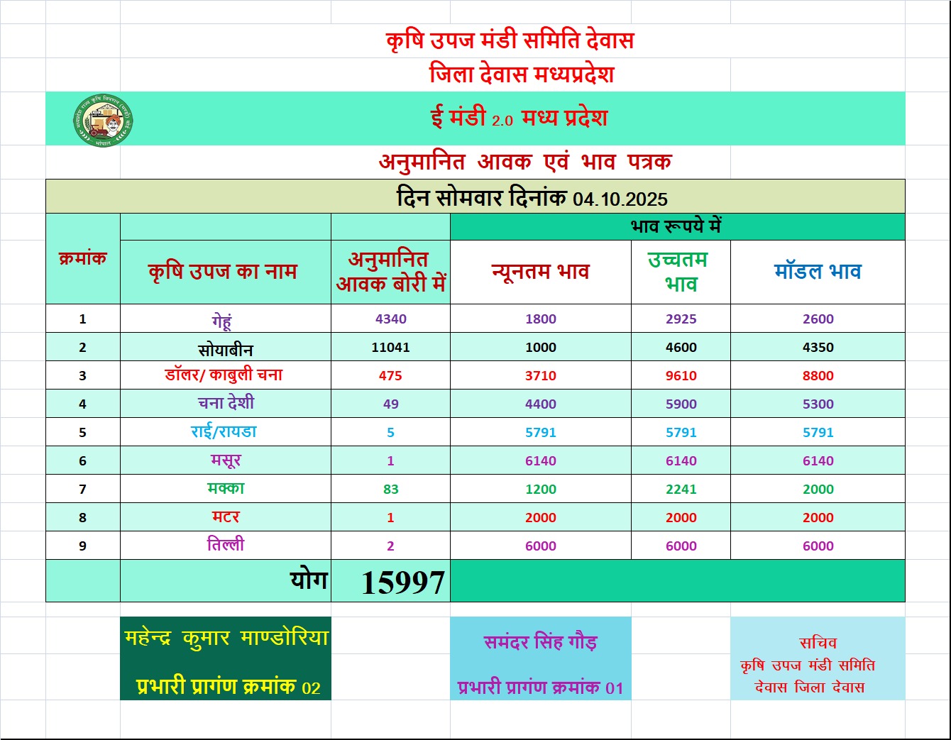 Today Dewas Mandi Bhav | आज का देवास मंडी भाव दिनांक : 04 अक्टूबर 2025 शनिवार