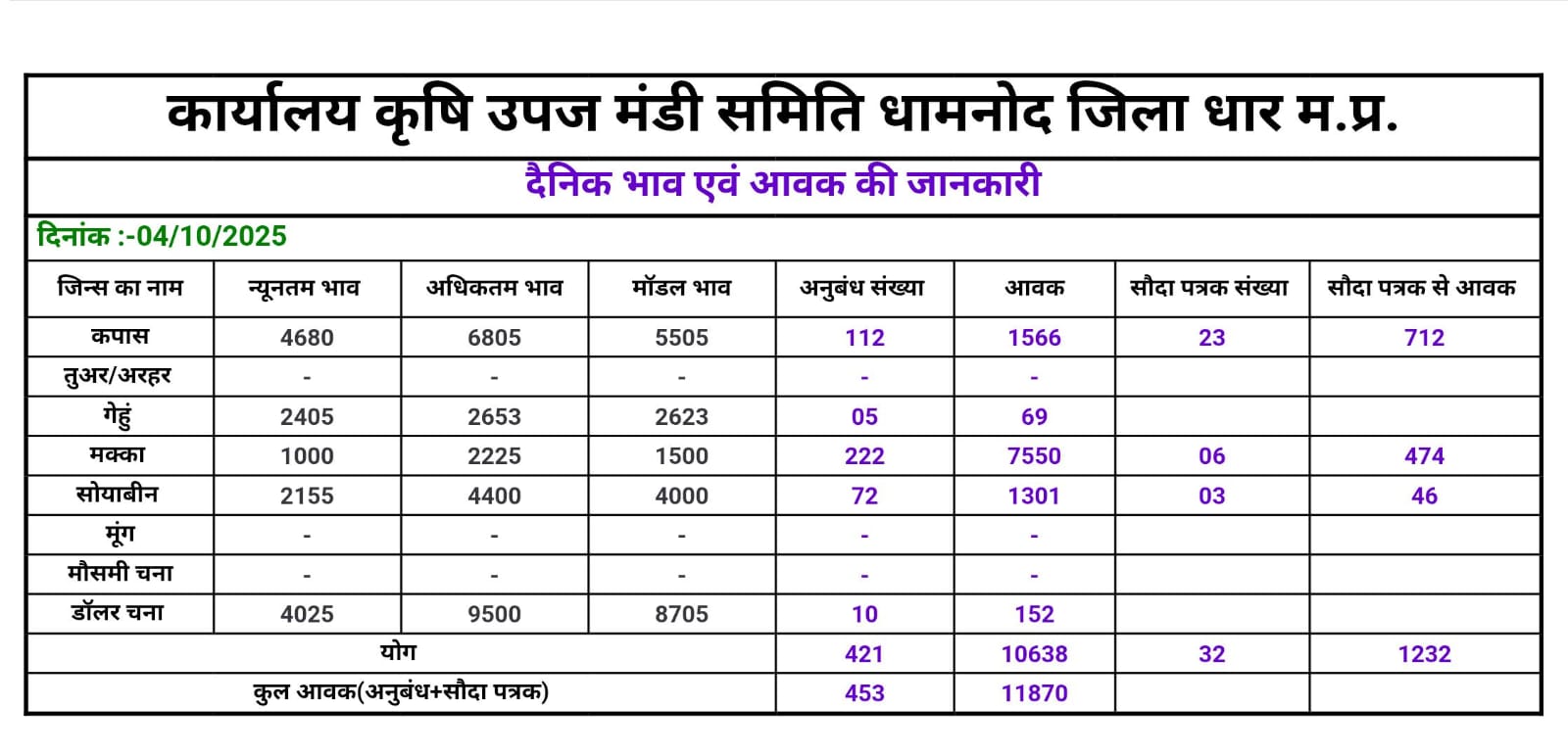 Today Dhamnod Mandi Bhav | आज का धामनोद मंडी भाव दिनांक : 04 अक्टूबर 2025 शनिवार