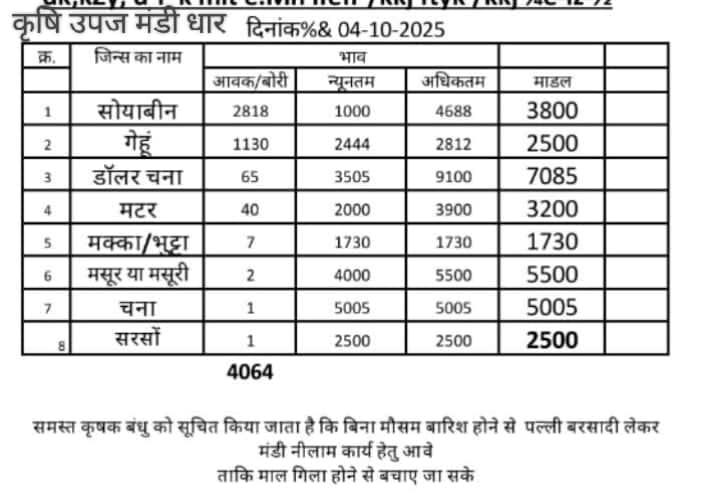 Today Dhar Mandi Bhav | आज का धार मंडी भाव दिनांक : 04 अक्टूबर 2025 शनिवार