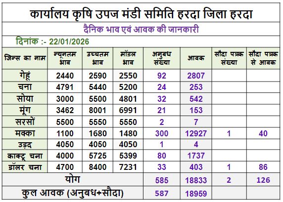 Today Harda Mandi Bhav | आज का हरदा मंडी भाव दिनांक : 22 जनवरी 2026 गुरुवार