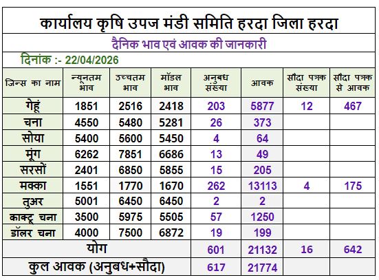 Today Harda Mandi Bhav | आज का हरदा मंडी भाव दिनांक : 22 अप्रैल 2026 बुधवार