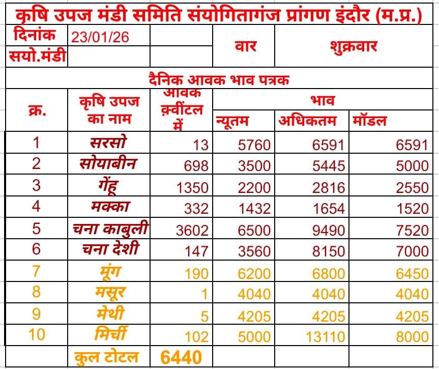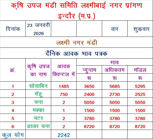 Today Indore Mandi Bhav | आज का इंदौर मंडी भाव दिनांक  : 23 जनवरी 2026 शुक्रवार