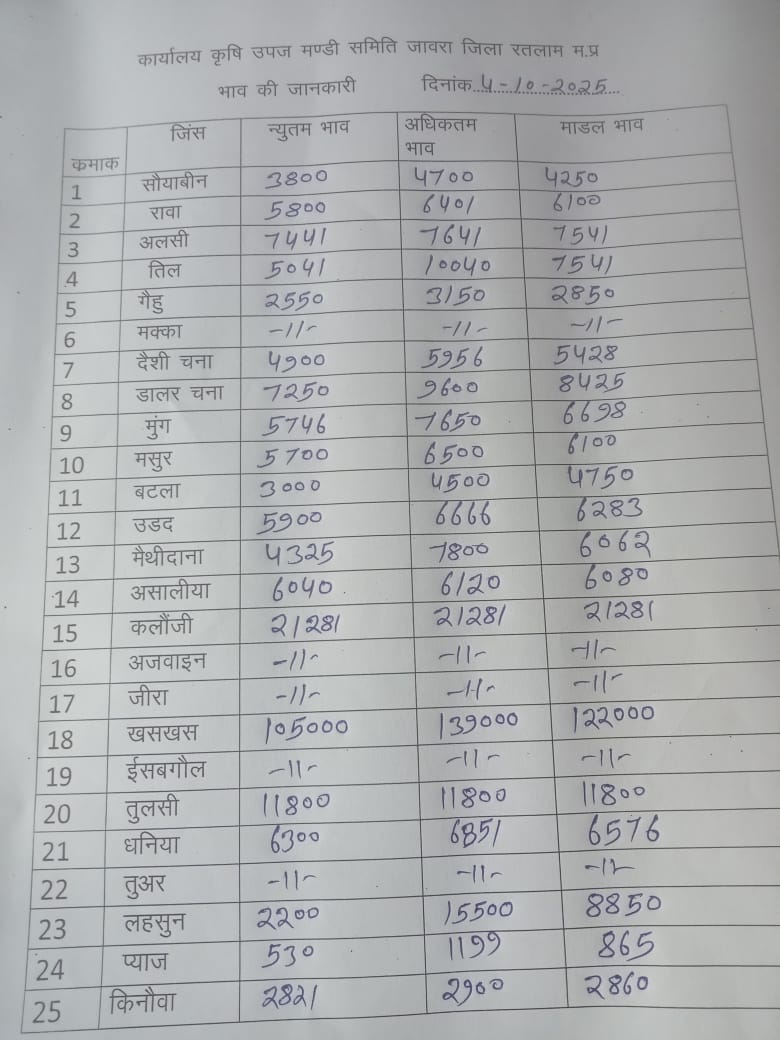 Today Jaora Mandi Bhav | आज का जावरा मंडी भाव दिनांक : 04 अक्टूबर 2025 शनिवार