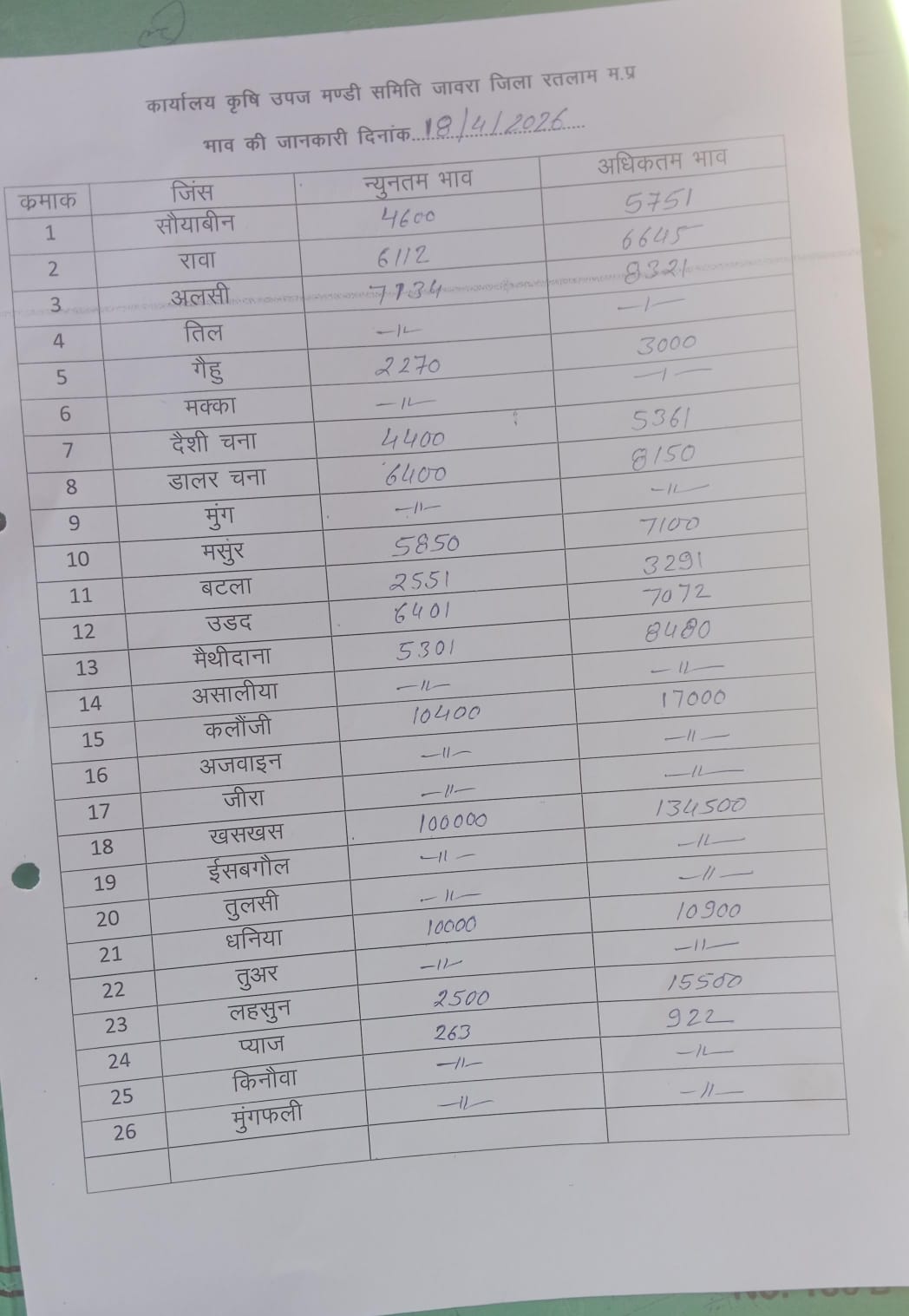 Today Jaora Mandi Bhav | आज का जावरा मंडी भाव दिनांक : 18 अप्रैल 2026 शनिवार