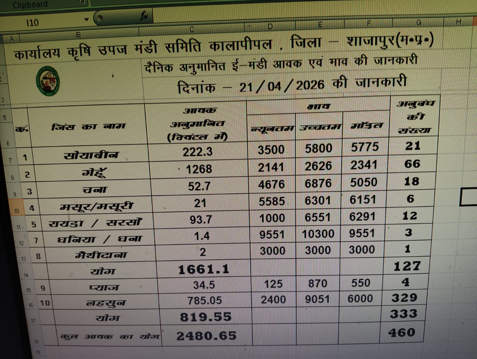 Today Kalapipal Mandi Bhav | आज का कालापीपल मंडी भाव दिनांक : 21 अप्रैल 2026 मंगलवार