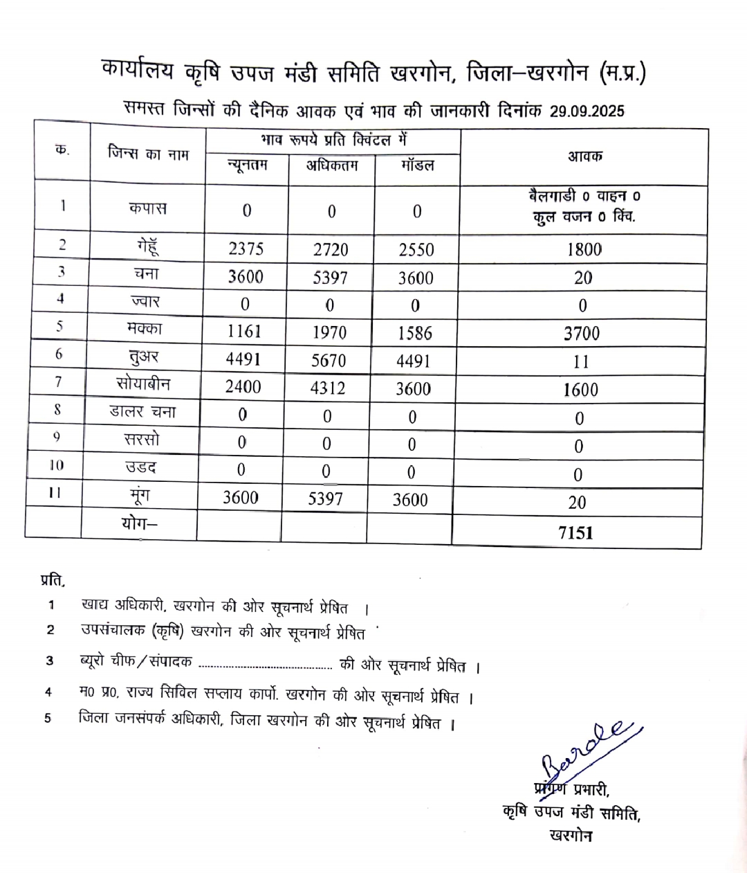 Today Khargone Mandi Bhav | आज का खरगोन मंडी भाव दिनांक : 29 सितंबर 2025 सोमवार