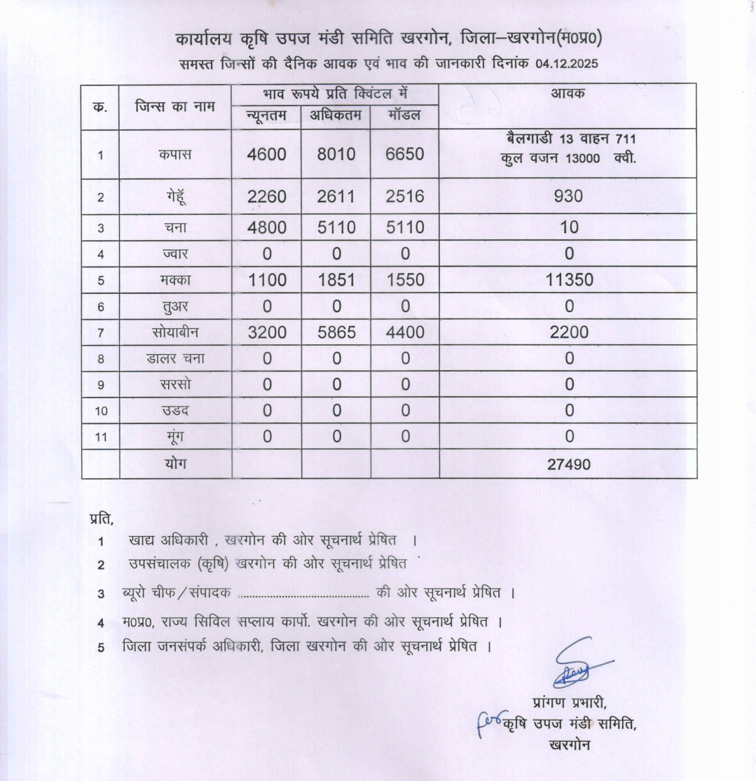 Today Khargone Mandi Bhav | आज का खरगोन मंडी भाव दिनांक : 4 दिसंबर 2025 गुरुवार