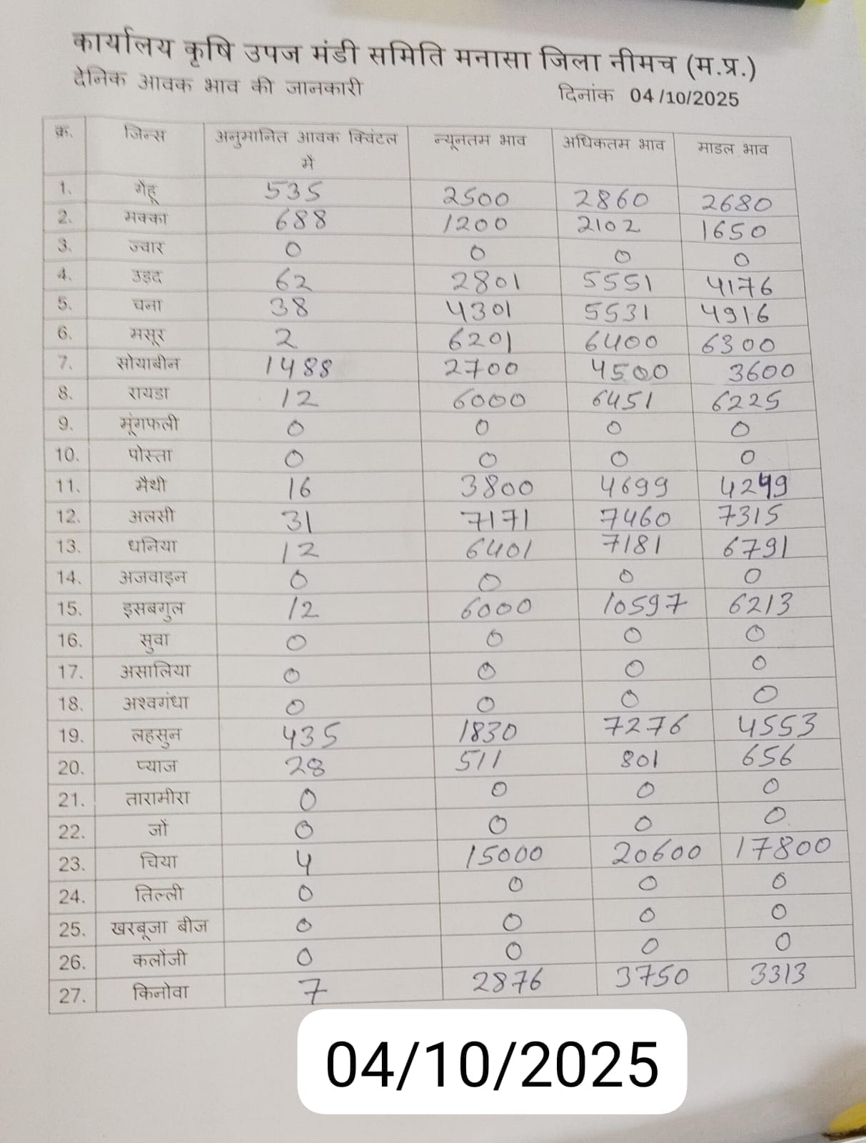 Manasa Mandi Bhav | आज के मनासा मंडी भाव दिनांक : 04 अक्टूबर 2025 शनिवार