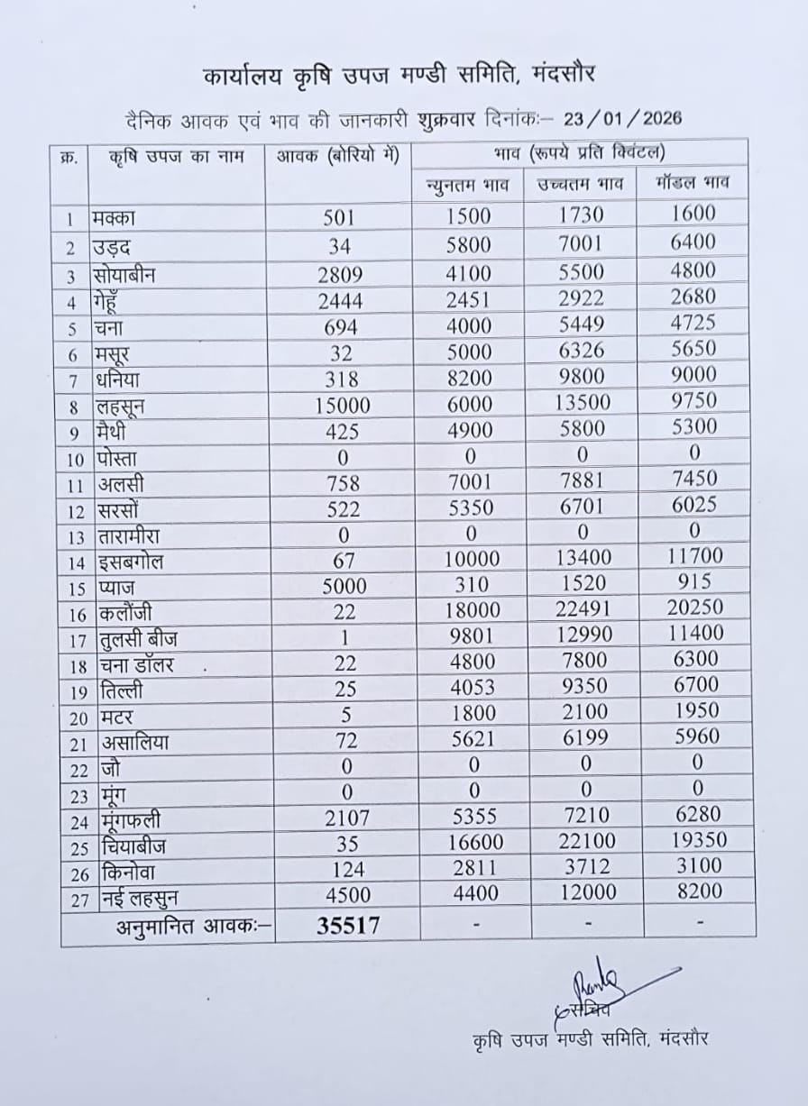 Today Mandsaur Mandi Bhav | आज का मंदसौर मंडी भाव दिनांक : 23 जनवरी 2026 शुक्रवार