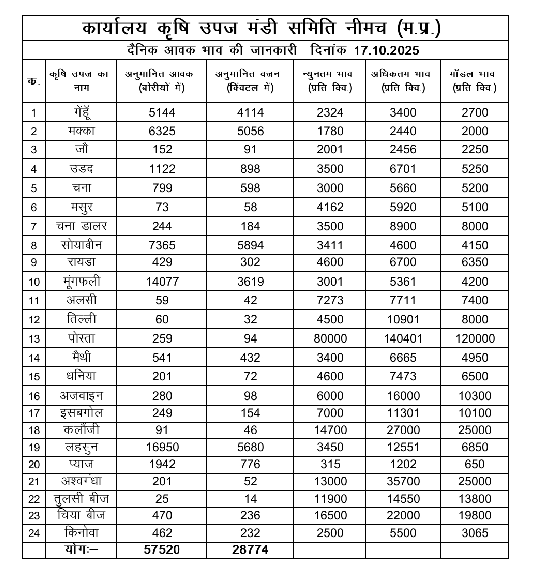 Today Neemuch Mandi Bhav | आज का नीमच मंडी भाव दिनांक : 17 अक्टूबर 2025 शुक्रवार