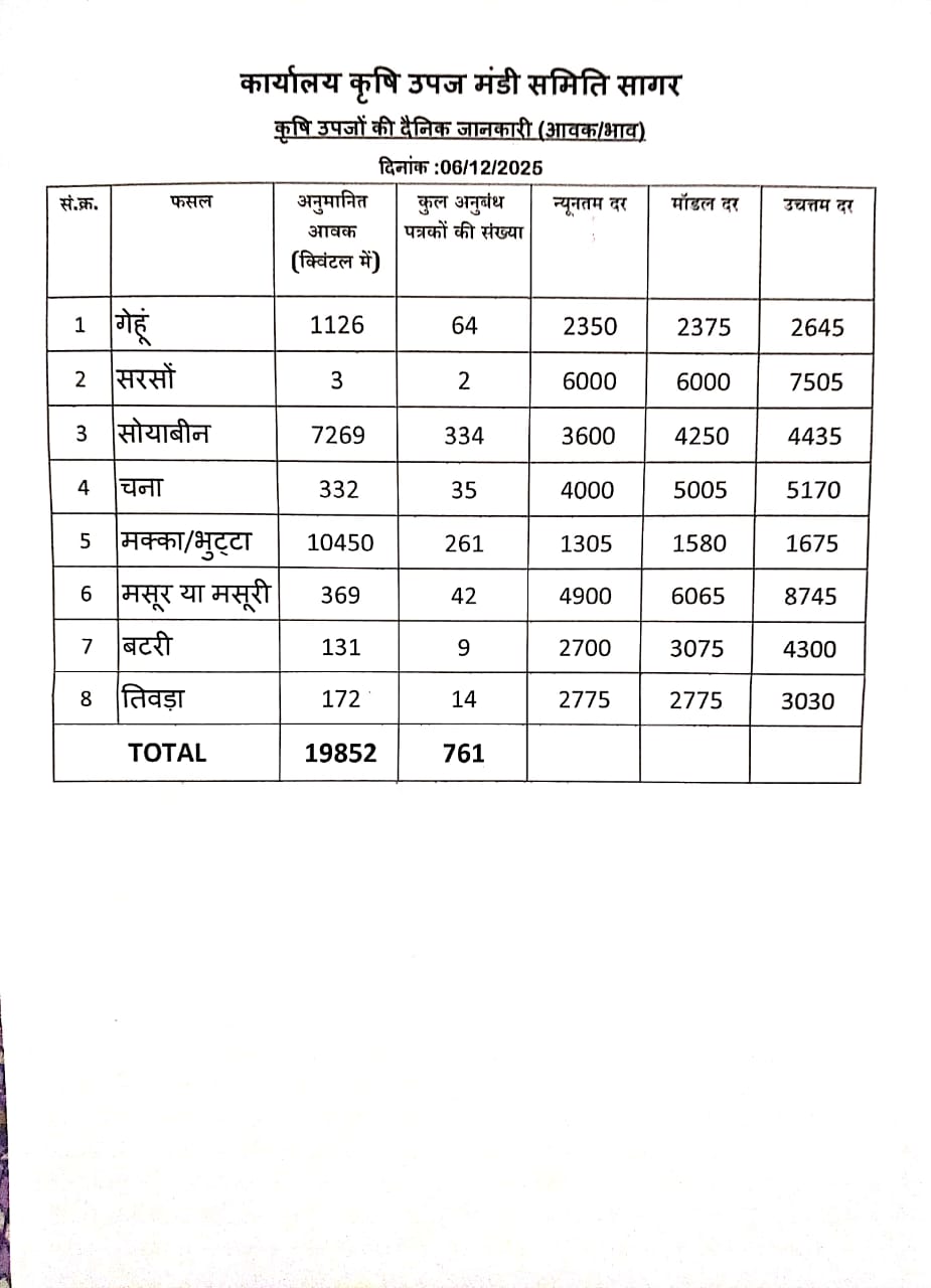 Today Sagar Mandi Bhav | आज का सागर मंडी भाव दिनांक : 06 दिसंबर 2025 शनिवार