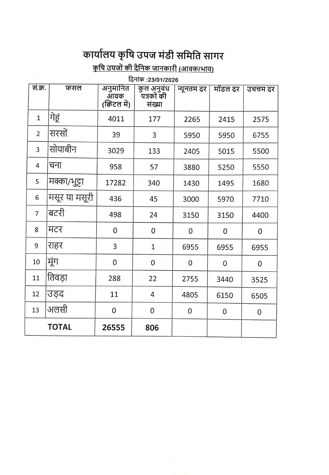 Today Sagar Mandi Bhav | आज का सागर मंडी भाव दिनांक : 23 जनवरी 2026 शुक्रवार