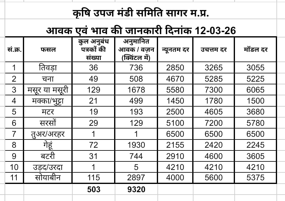 Today Sagar Mandi Bhav | आज का सागर मंडी भाव दिनांक : 12 मार्च 2026 गुरुवार