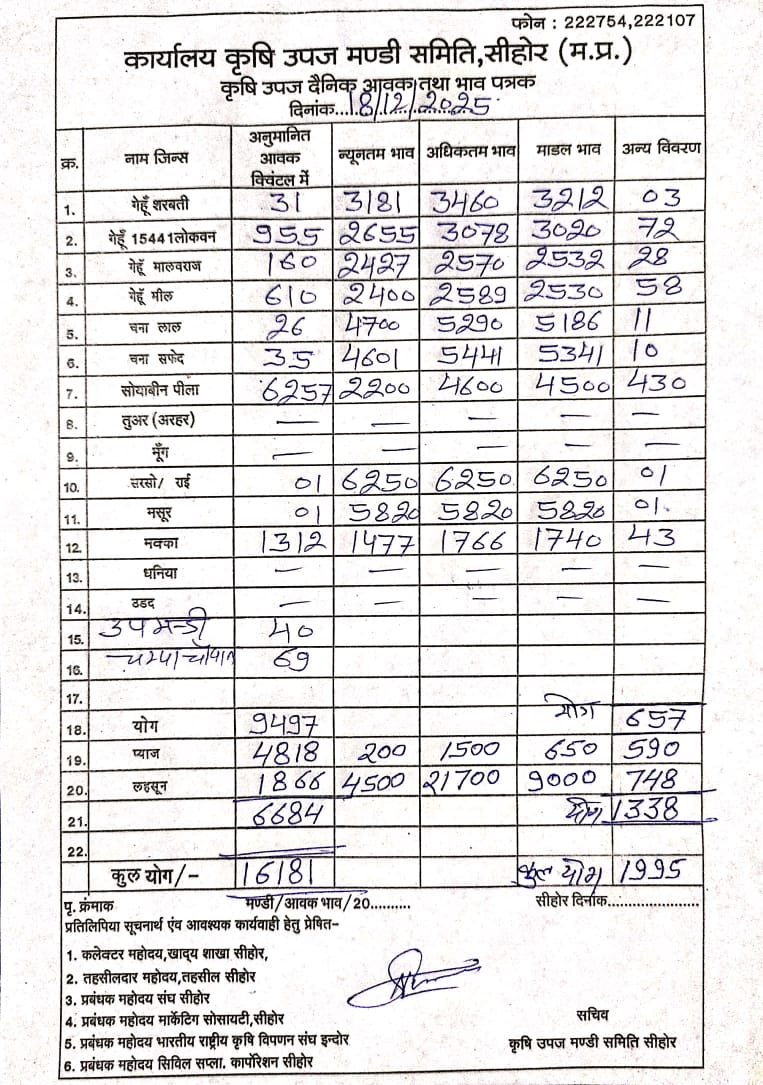 Today Sehore Mandi Bhav | आज का सीहोर मंडी भाव दिनांक : 18 दिसंबर 2025 गुरुवार