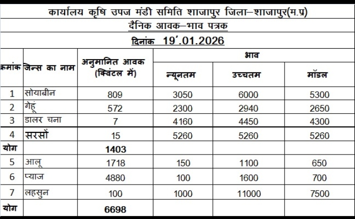 साथियों आप को इस पोस्ट के माध्यम से Shajapur Mandi Bhav प्राप्त होंगे शाजापुर मंडी में गेंहू, सोयाबीन, डालर चना, चना, सरसों, मसूर, धनिया, आलू, प्याज, लहसुन आदि फसलों की आवक प्रतिदिन शाजापुर मंडी में देखने को मिलती हैं साथियों आप Shajapur Mandi Bhav के अलावा मध्यप्रदेश की बाकी सभी मंडियों के भाव आप इस लिंक पर https://dailymandibhav.net क्लिक करके भी देख सकते हैं।