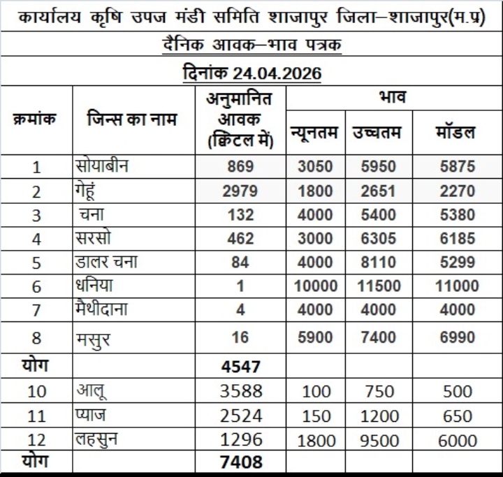 Today Shajapur Mandi Bhav | आज का शाजापुर मंडी भाव दिनांक : 24 अप्रैल 2025 शुक्रवार