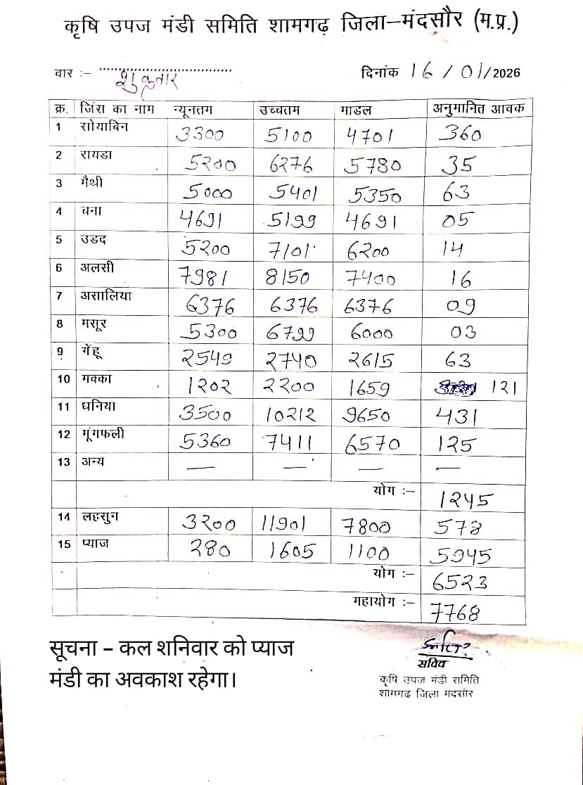 Today Shamgarh Mandi Bhav | आज का शामगढ़ मंडी भाव दिनांक : 16 जनवरी 2026 शुक्रवार