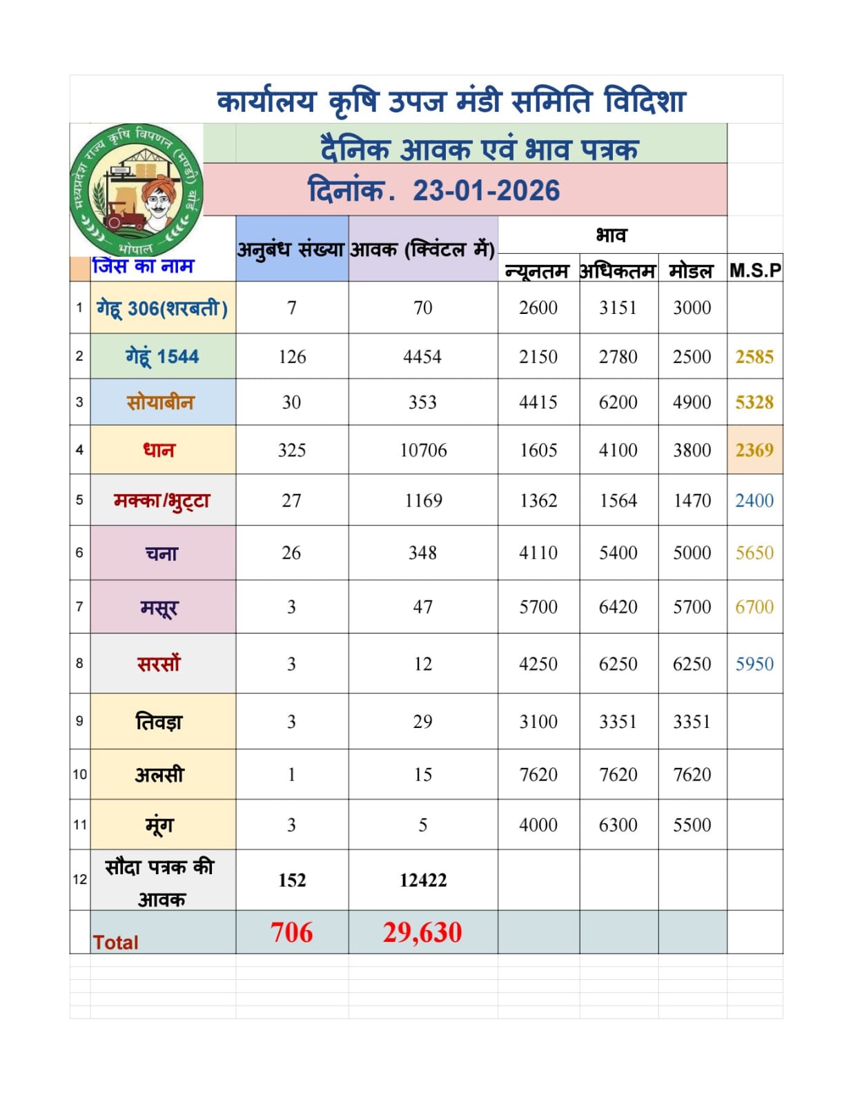 Today Vidisha Mandi Bhav | आज का विदिशा मंडी भाव दिनांक : 23 जनवरी 2026 शुक्रवार